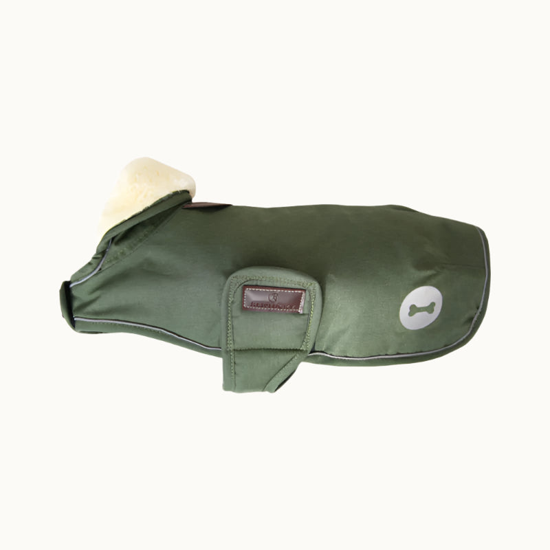 The dog coat?s waterproof outer shell fabric is made of a durable 10 000mm (ISO standard) waterproof polyester with a breathable membrane. Thanks to this, your dog can run in the rain all day long without getting wet. The piping and the logo on the side are reflective to keep your dog visible in the dark. To protect your dog from cold weather, the dog coat has a filling of 300g and features an artificial rabbit skin lining. This lining creates tiny air pockets that trap and retain the body heat of the dog. It also polishes the dog?s fur. A little artificial sheepskin hood provided; this hood can be folded back over the neck for extra cover. Under the hood, there?s an artificial leather flap. Under the flap is a small hole to put a lead through.