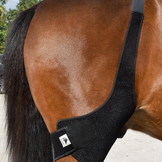 Fenwick Liquid Titanium Far InfraRed Stifle Wrap Enhance your horse's recovery with Fenwick Equestrian's Liquid Titanium Far InfraRed Stifle Wrap. Utilizing patented Liquid Titanium fabric, these therapeutic stifle wraps improve blood flow and accelerate healing naturally. Key Features: Far InfraRed Technology: Promotes natural healing by enhancing blood circulation. No Warmup Required: Ready to use instantly. Comfortable Fit: Lightweight, breathable, and stretchable for a snug fit with adjustable Velcro? straps. Durable and Washable: Retains therapeutic qualities after repeated washes. Air dry One Size: Horses Usage Guidelines: Preferred Use: This product is exclusively for stall use. Initial Supervision: Recommended to monitor the horse when first using the stifle wrap. A gel or neoprene pad can be placed under back Velcro? strap Benefits: Radiant Heat: Improves blood circulation and oxygenation. Metabolism Boost: Enhances metabolism and overall health. Pain Relief: Alleviates aches and muscle stiffness. Experience the Natural Healing of Liquid Titanium! Give your horse the edge with Fenwick's drug-free therapeutic stifle wraps. Heal naturally and improve performance with Liquid Titanium! Liquid Titanium is our brand name.