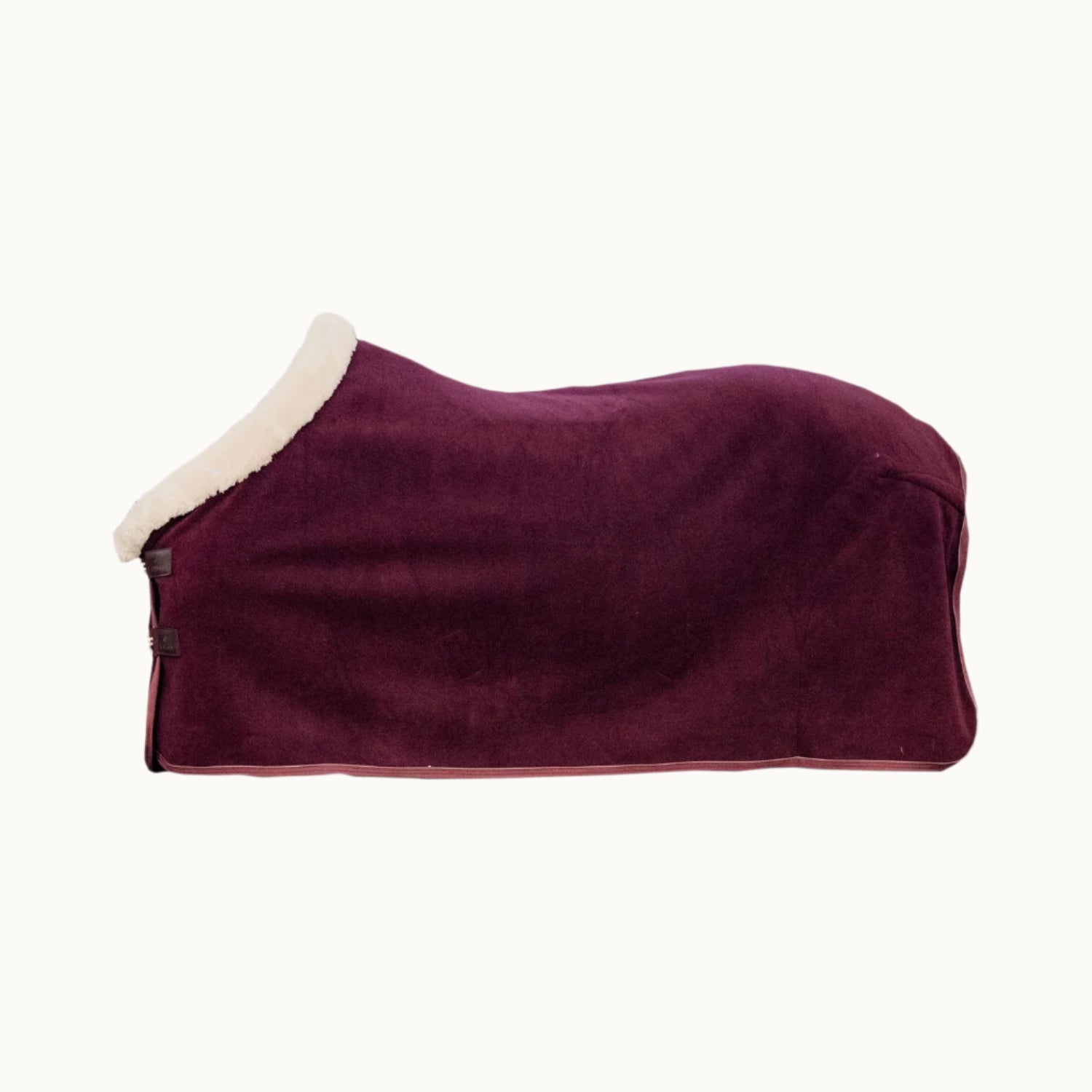 The rug is highly absorbent and quickly wicks away sweat or water. The entire neck and chest are covered with vegan sheepskin, which not only provides warmth but also adds comfort. The rug is finished with vegan leather piping and elegant front closures.