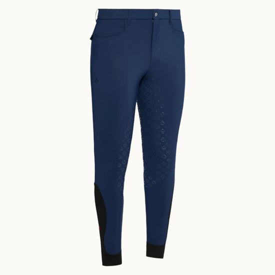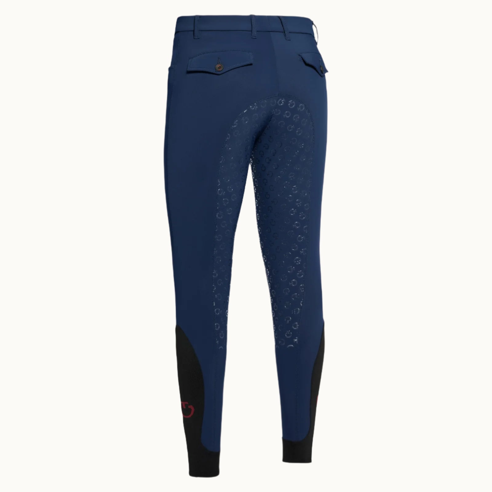 The Cavalleria Toscana men's full grip dressage breeches perfectly adhere to the saddle, without constricting your movements. They are made from 4-way stretch technical jersey, combining elegance and performance. It provides breathability, antibacterial properties and UV protection, ideal for sporting activies. The breeches features two front pockets and two back pockets with button, they are refined by a small embroidered logo on the thigh and on the elastic socks.