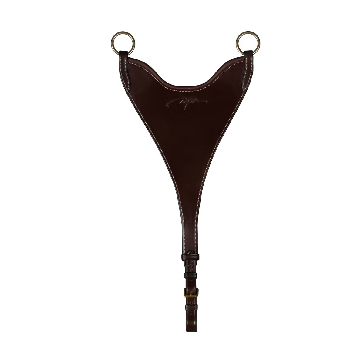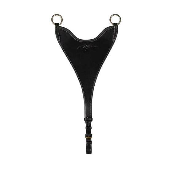 Adjustable full bib martingale made of stiff Dy’on leather.Attaches to a yoke or breastplate by means of a roller buckle.