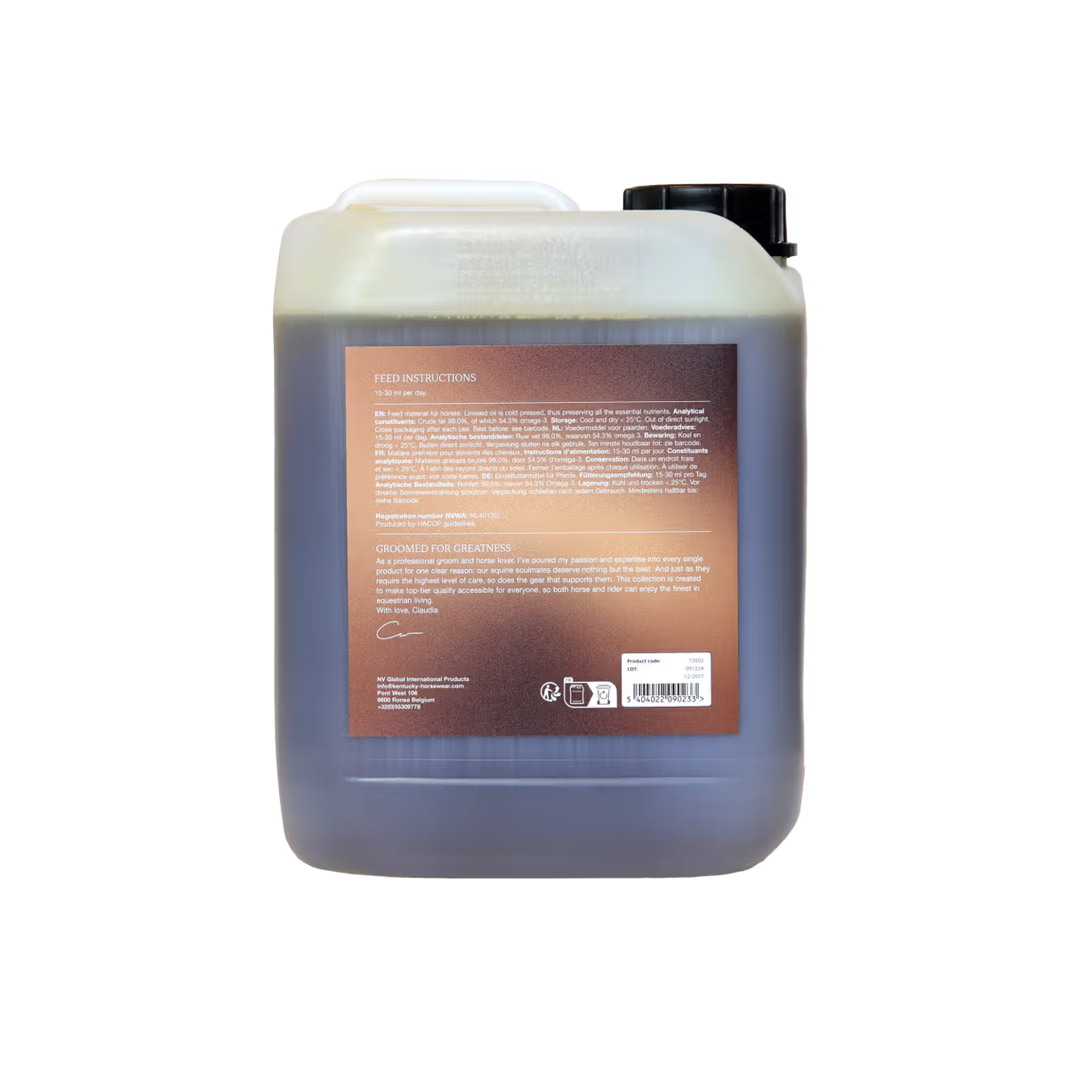 An essential addition to your horse's diet, this high-quality linseed (flaxseed) oil is rich in omega-3 fatty acids, vital for maintaining a healthy skin, coat, and immune system support. Cold-pressing preserves all active ingredients, ensuring your horse receives the full benefits of this natural supplement. Not only does it enhance coat shine and skin health, but it also aids in digestion, supports weight management, and is particularly beneficial during the shedding period.