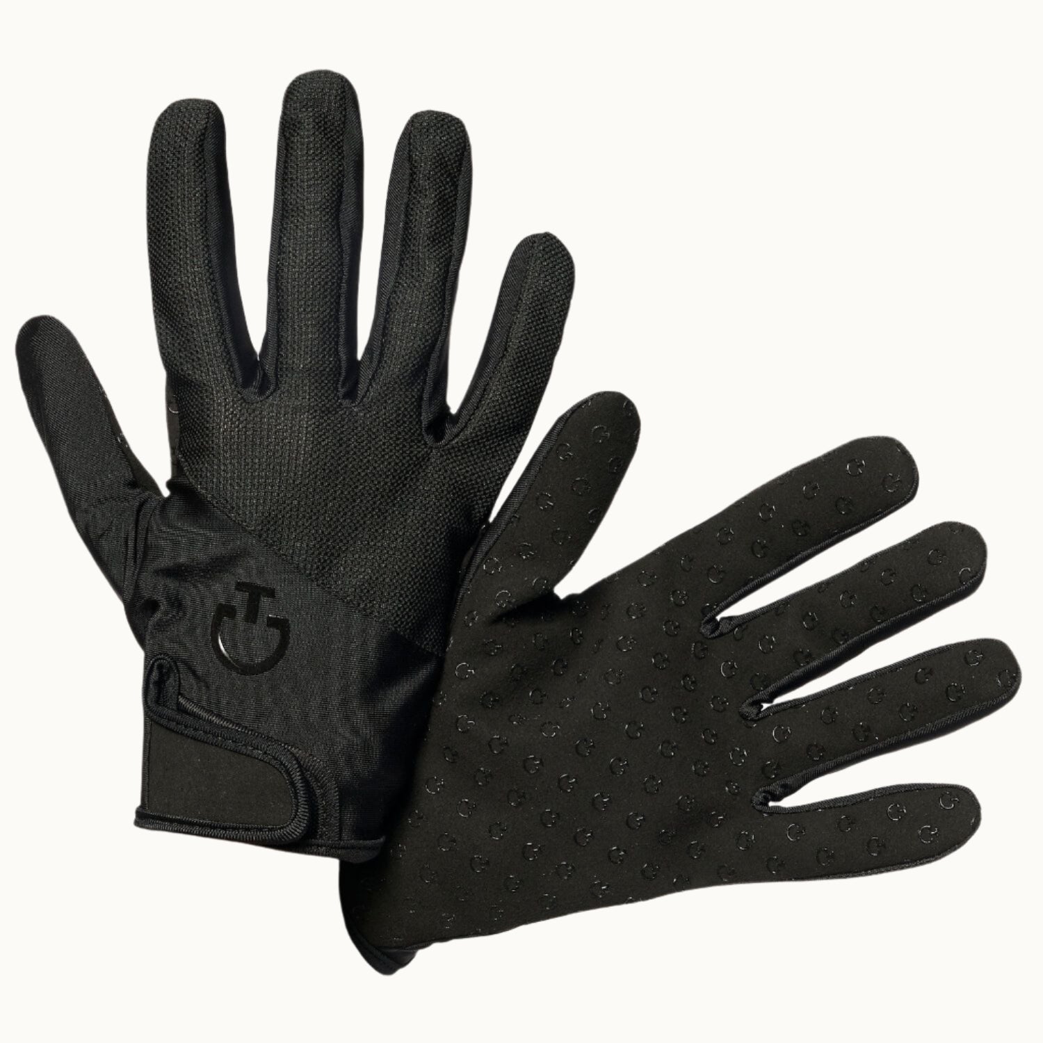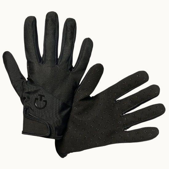 These performance riding gloves are in a mix of two materials: jersey and breathable stretch micro mesh that extends in four directions to perfectly embrace the shape of the hand. The palm is covered in suede-effect fabric with small silicone CT logo details for extra grip. A touch fastener strap secures the wrist and a Cavalleria Toscana logo trims the back of the hand.