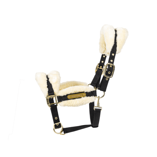 The halter is made of nylon. On the nose, behind the ears, and on the cheeks, artificial sheepskin is sewn onto the nylon. The halter features a gold-coloured plate with our engraved logo. This plate can be turned around and engraved with your horse's name. All the buckles are gold-coloured and therefore match our leads perfectly.