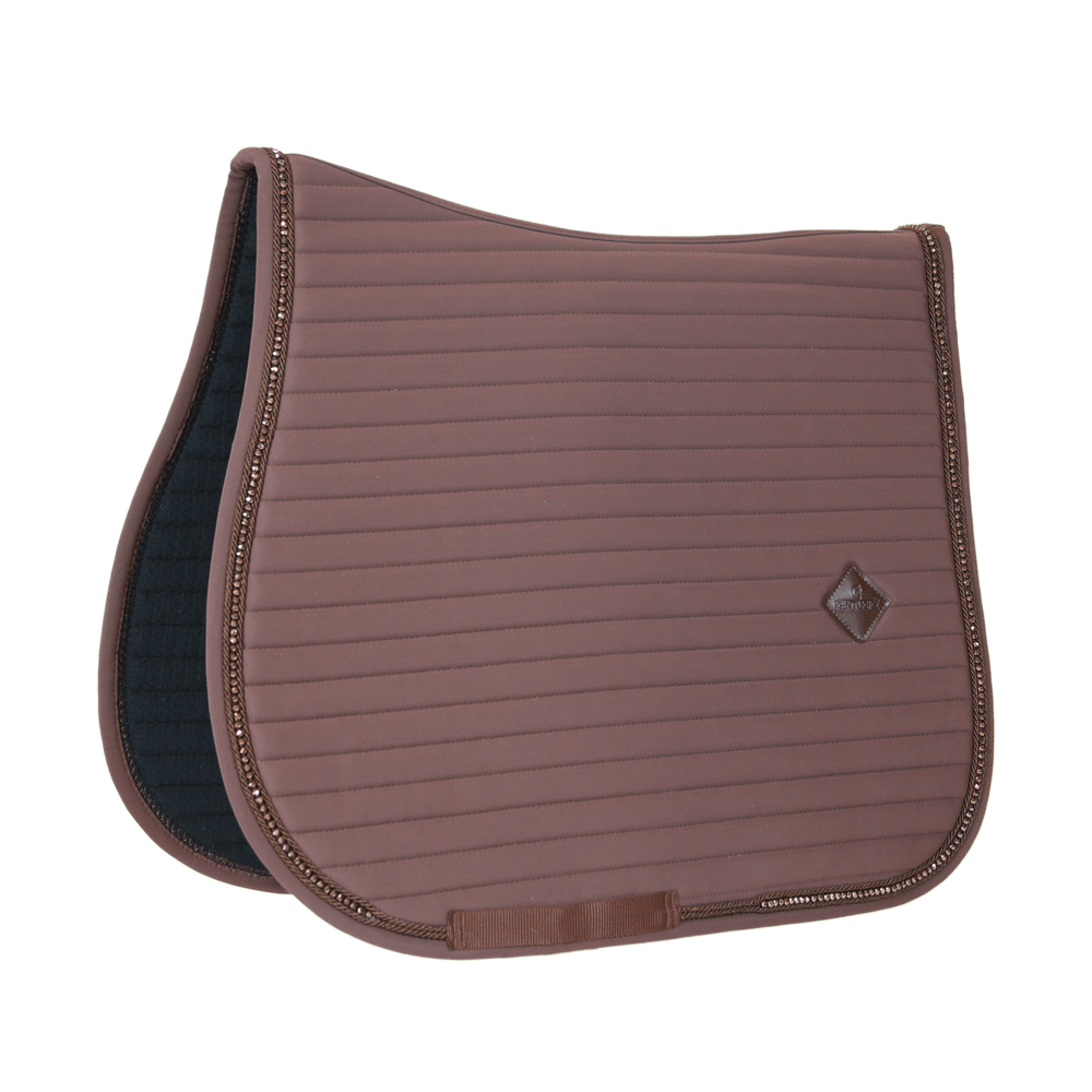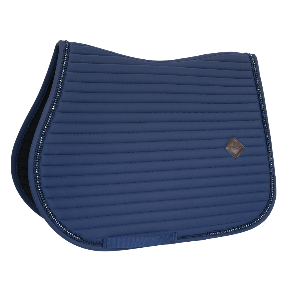 Our Saddle Pad Pearls is shaped for jumping and provides excellent cushioning between the horse?s back and the saddle while protecting against friction. This saddle pad has a unique horizontal quilting and is made out of a breathable material (43% Nylon, 43% Polyester and 14% Spandex). The saddle pad has no annoying straps to attach to the saddle, only a nylon strap for the girth.