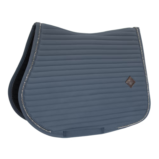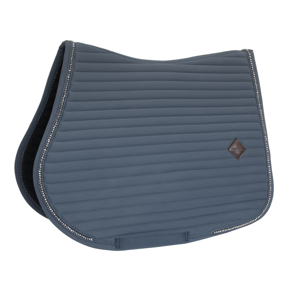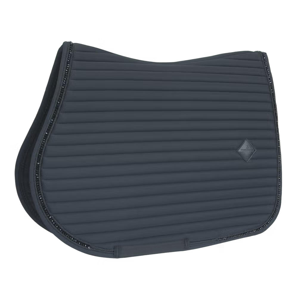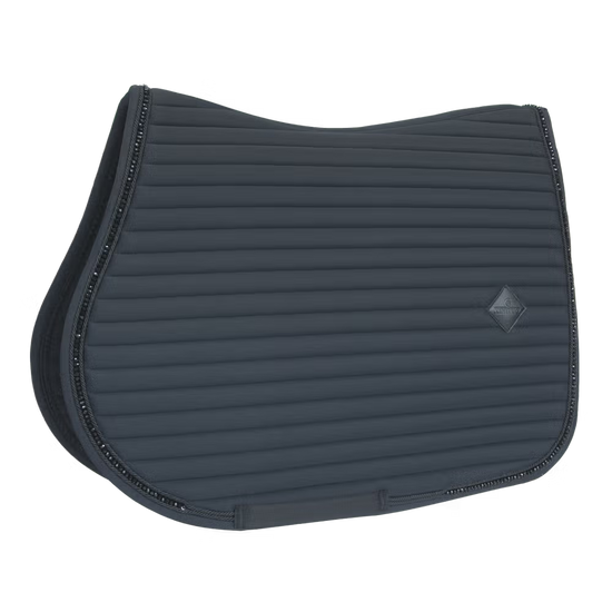 Our Saddle Pad Pearls is shaped for jumping and provides excellent cushioning between the horse’s back and the saddle while protecting against friction. This saddle pad has a unique horizontal quilting and is made out of a breathable material (43% Nylon, 43% Polyester and 14% Spandex). The saddle pad has no annoying straps to attach to the saddle, only a nylon strap for the girth.