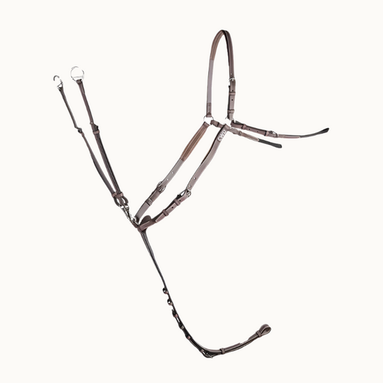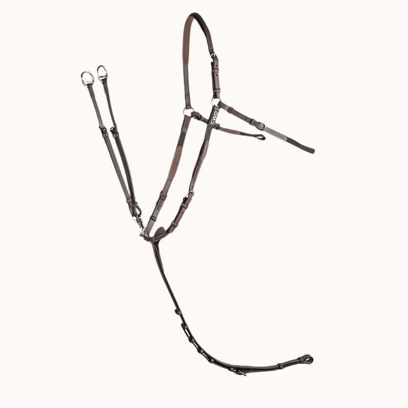 This hunting breastplate with adjustable bridge is an innovative product thanks to its girth strap fastening system which keeps the saddle in place, removes all the pressure on the withers and reduces chaffing on the horse?s shoulder. Its advantage? Our snap hook rings allow the martingale to be easily attached to the reins. Benefits: