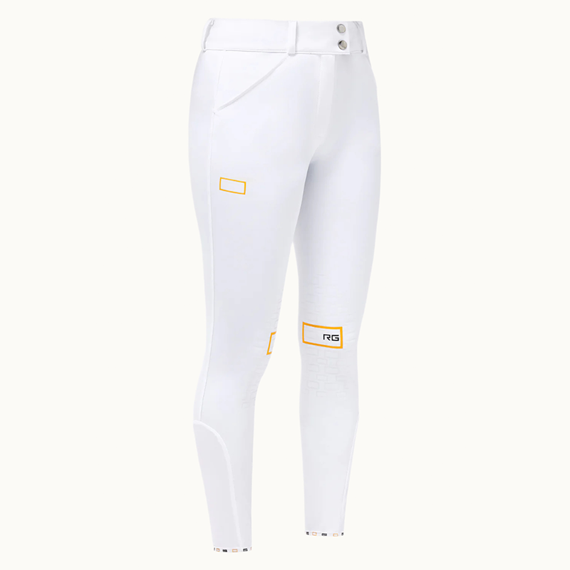 These riding breeches are made of bi-stretch technical fabric and have a tone-on-tone grip at the knee to ensure the right fit to the saddle.The special feature of this model is the hidden grip inside the belt, perfect for better adhering to your shirt. It features a zip closure on the front reinforced by a double button and wide loops to be worn comfortably with the belt.The sock in the final part of the trousers wraps the calf under the boot and has a breathable action.The contrasting printed RG logo finish gives the garment a modern look.Available in various colors.