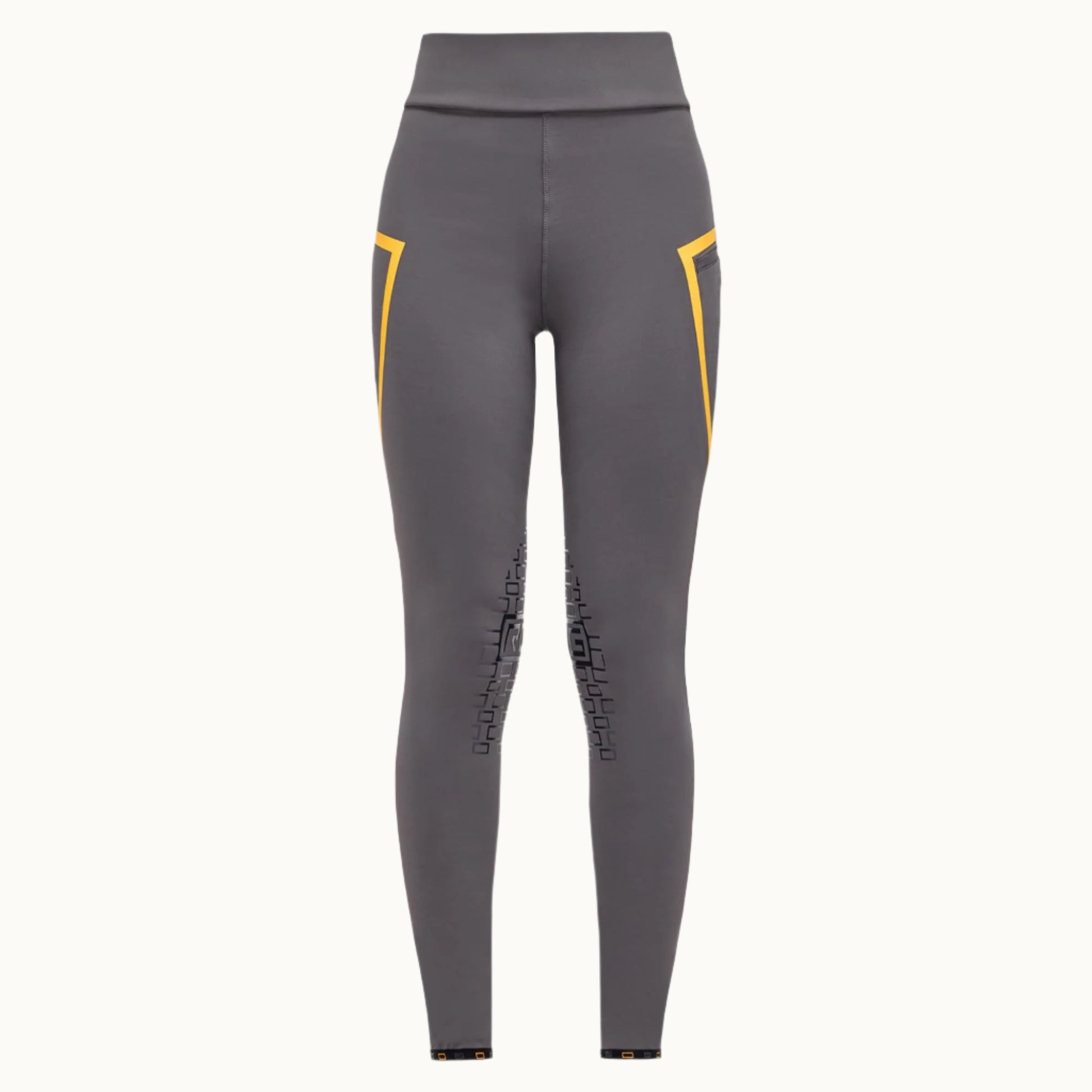 These riding breeches are made of bi-stretch technical fabric and have a tone-on-tone grip at the knee to ensure the right fit to the saddle.The special feature of this model is the hidden grip inside the belt, perfect for better adhering to your shirt. It features a zip closure on the front reinforced by a double button and wide loops to be worn comfortably with the belt.The sock in the final part of the trousers wraps the calf under the boot and has a breathable action.The contrasting printed RG logo finish gives the garment a modern look.Available in various colors.