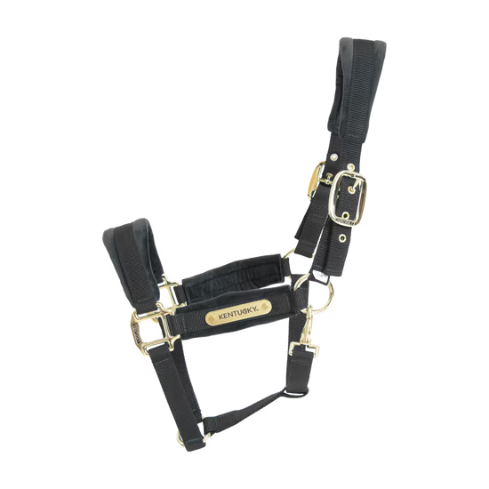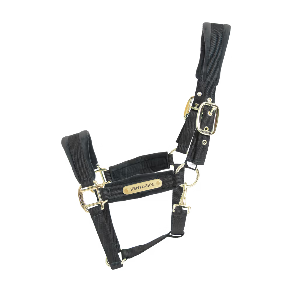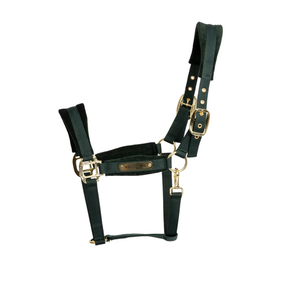 The halter is made from a strong nylon, to ensure your horse?s safety. The nose, cheek, and crownpiece are reinforced with velvet padding. This is very soft to touch and comfortable to wear. The halter closes with a gold brass carabiner hook and is adjustable on both sides of the crown piece for a perfect fit.
