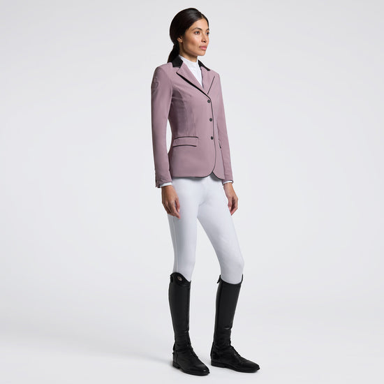 The Cavalleria Toscana women's competition jacket features a classic and fitted design, refined by a collar and alcantara piping in contrasting colour. It comes with two front pockets, three buttons fastening, and a sublte embossed logo on the shoulder. The elegant cut is combined with the technical 4-way stretch jersey, which provides breathability and water repellency. It fits perfectly to the body, following through your movements.