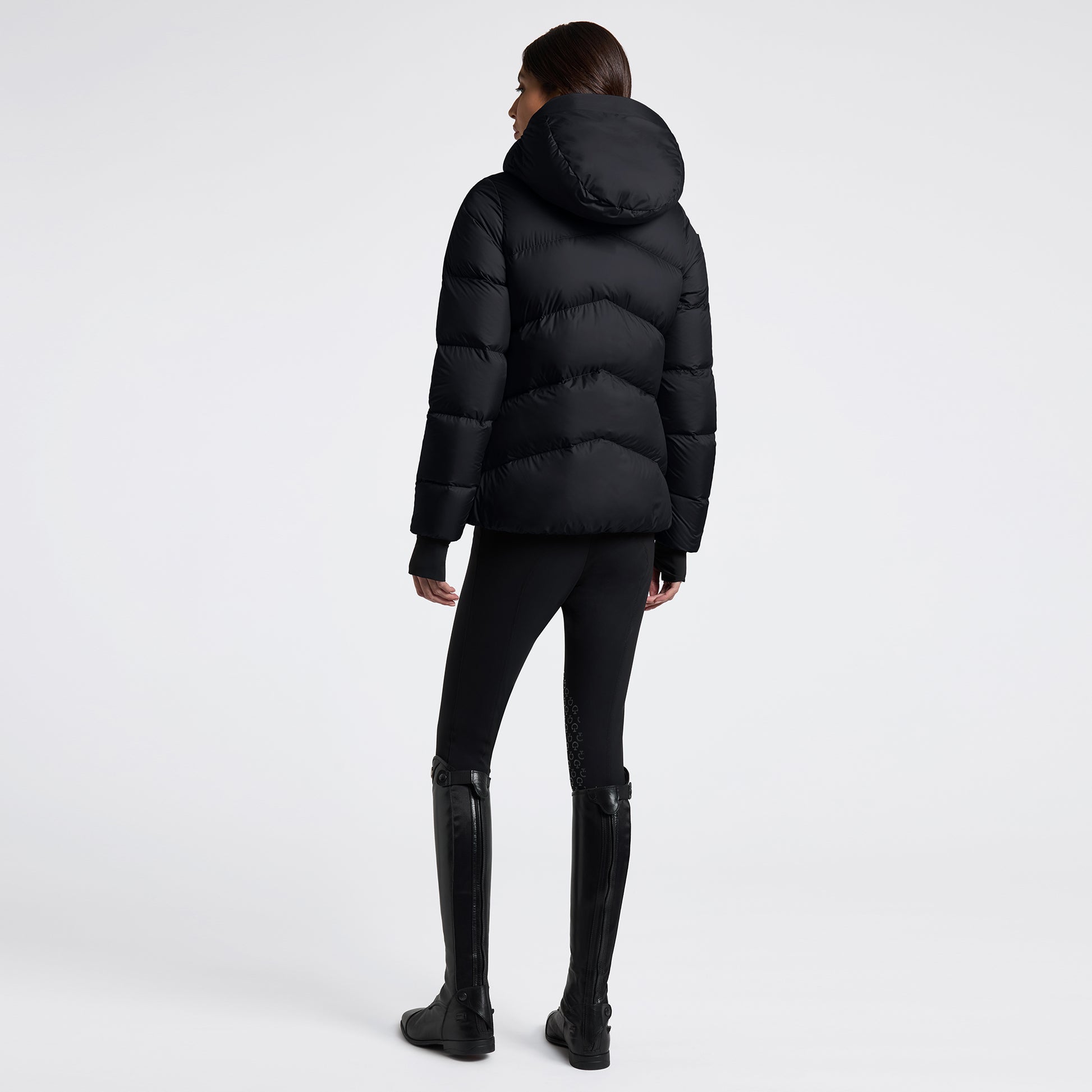 The Cavalleria Toscana Women's Padded Nylon Hooded Jacket is a technical garment designed to deliver warmth and protection in cold weather. The outer fabric is water-resistant and durable, while the inner construction provides thermal comfort. It features a high collar, wrap-around hood, fleece-lined pockets and heat-sealed zippers. Finished with the Cavalleria Toscana logo on the sleeve, this padded jacket combines sporty elegance with functionality—perfect for riding and everyday wear.